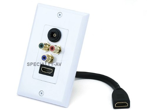 NEW White Decora style HDMI Component Video Optical Audio wall plate.HDMI for digital high definition video, 3 RCA connectors for component video supporting analog high definition and a TOSLINK connector for digital optical audio. This convenient plate gives you the most popular connection types and lets you hide the cables behind the wall to keep your floor clean and clutter free.Coupler style connectors feature female connections on both the front and back of the plate so there's no need to cut, splice, or solder any wires. For added convenience, the HDMI adapter has an extension cable included. The new two piece inset design makes the installation process easier as well as offering a more professional look. Readmore .. .